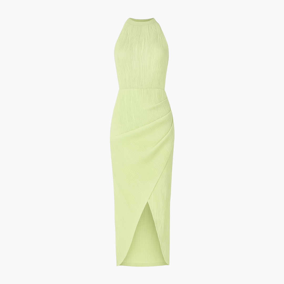 • Allunga visivamente la figura — grazie allo scollo halter e al taglio avvolgente