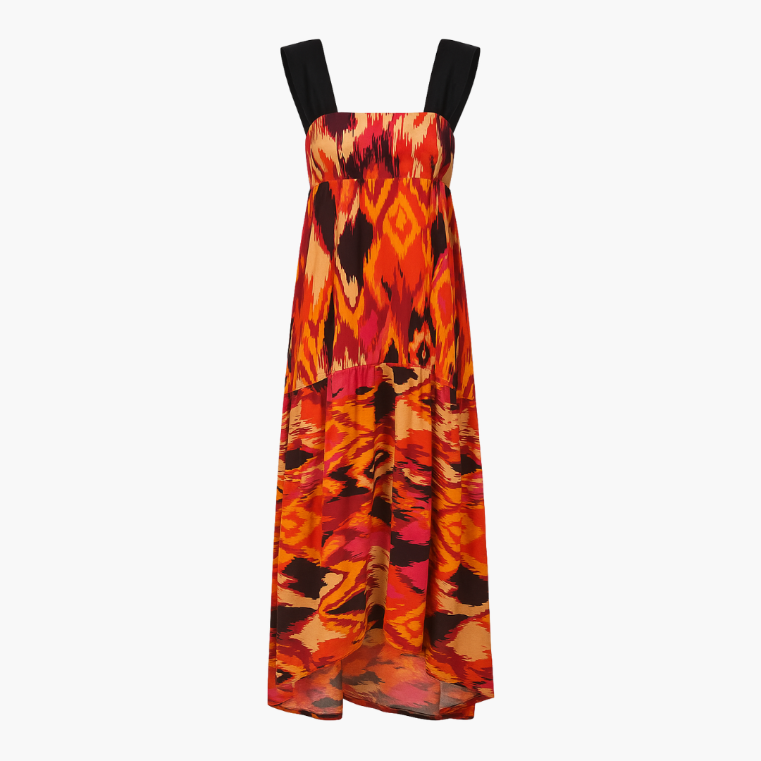 Abito da festa lungo con orlo asimmetrico e volant sul fondo, spalline in taffetà nero. Tessuto in crêpe di viscosa con stampa etnica nei toni del fucsia, arancione e beige.